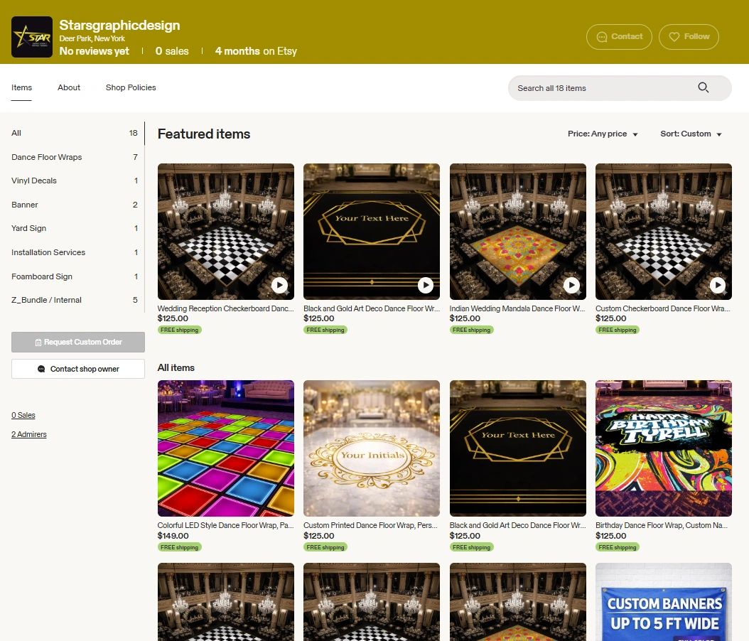 Explore our full collection of custom printed products including dance floor wraps, banners, welcome signs, window graphics, and more.